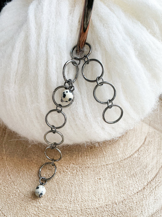 Að sjálfsögðu nýtast þessi prjónamerki í öll verkefni eins og hver önnur, og alls ekki alltaf sem þarf að nýta þau öll. Settin koma á opnanlegum hring sem heldur utan um merkin þegar þau eru ekki í notkun.