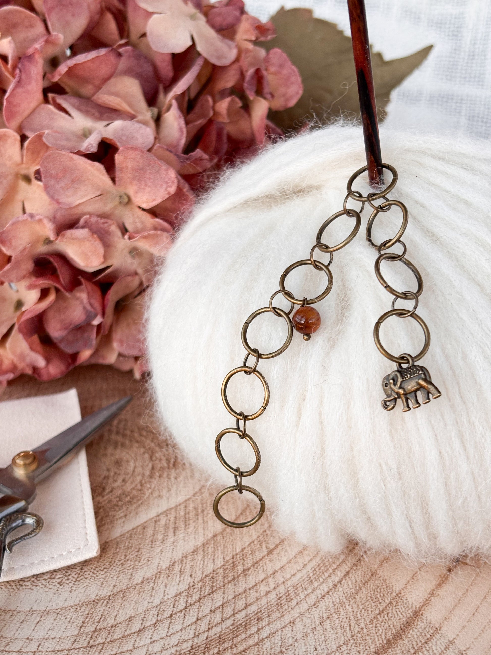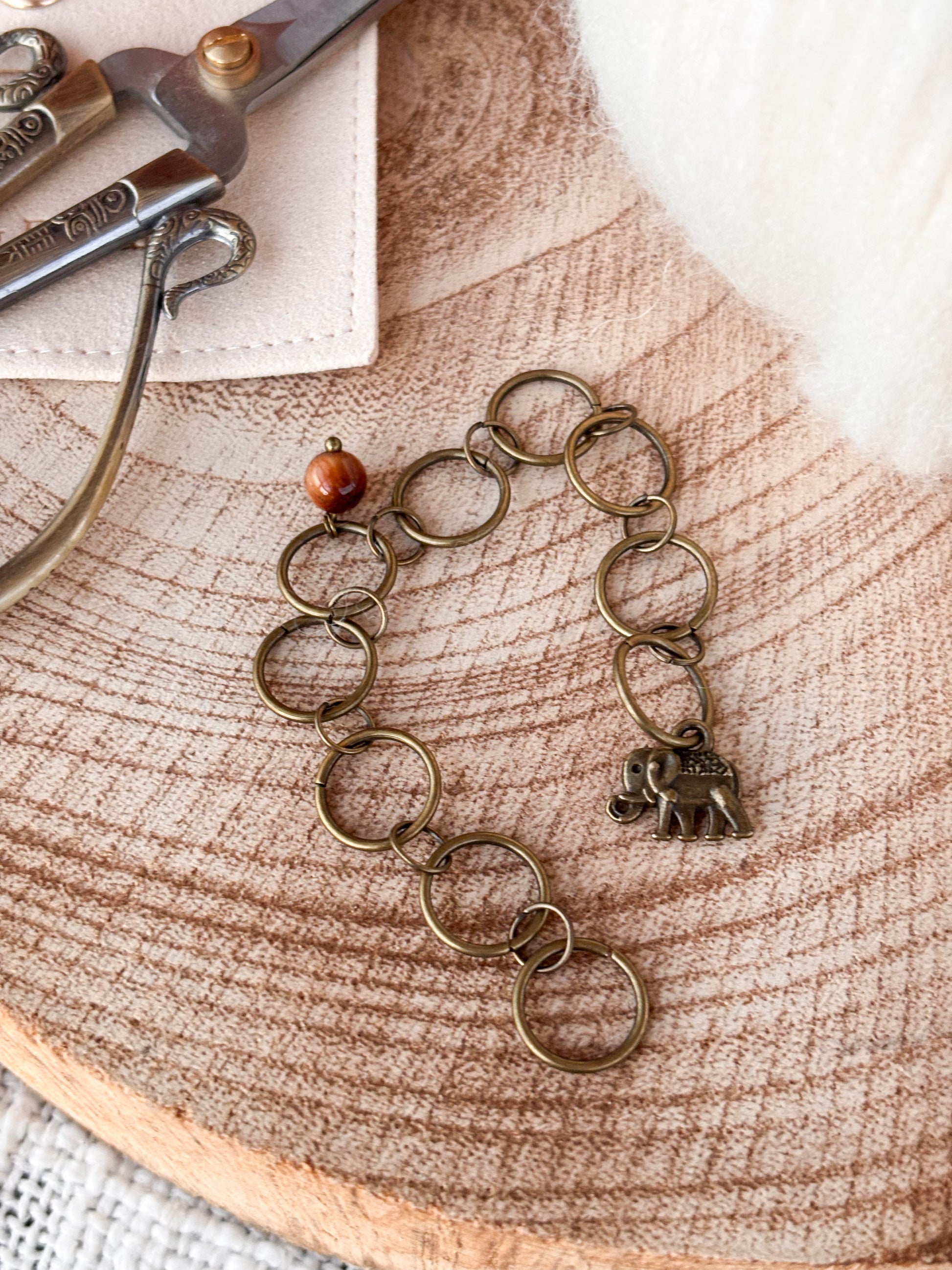Fallegur prjónafiskur þar sem fílinn minnir okkur á jarðtengingu og rauði Tiger eye steinninn örvar orkustöðvarnar