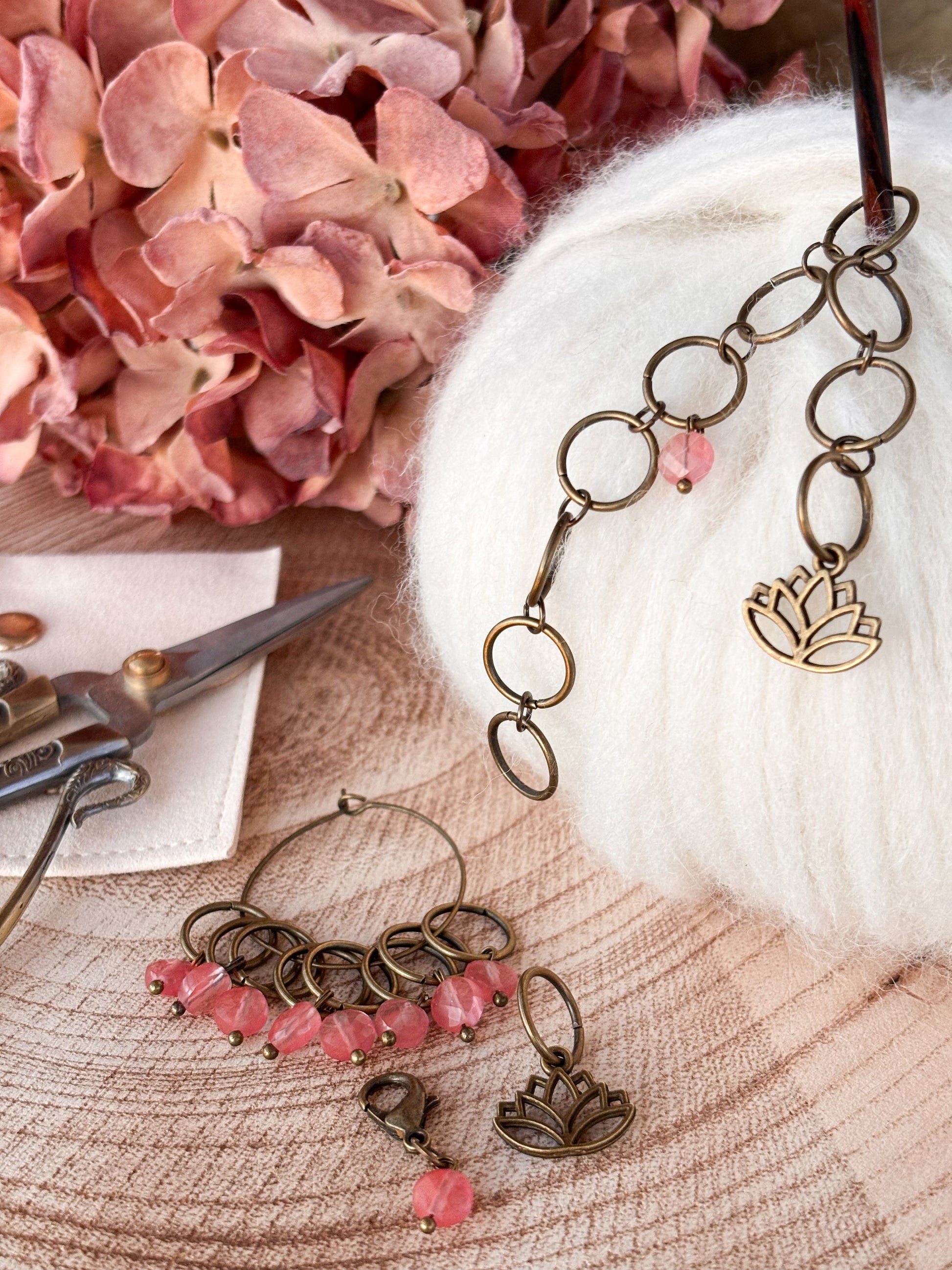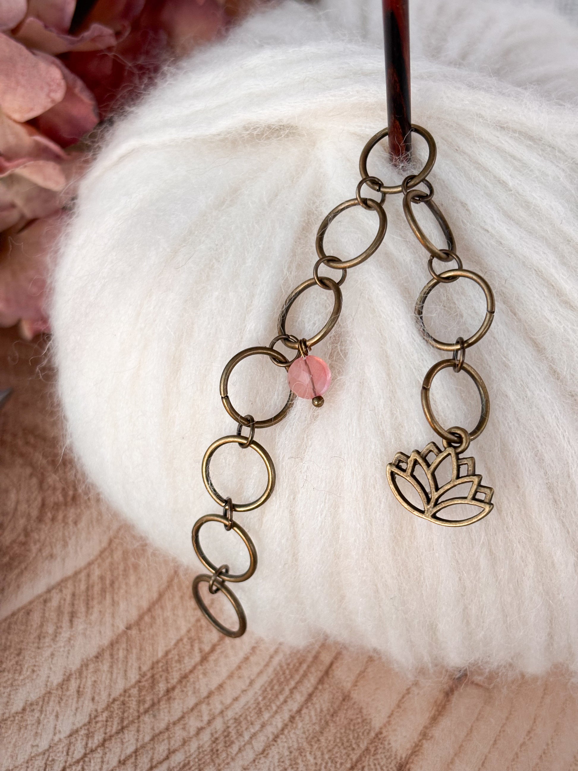 Fallegur prjónafiskur með lotus blómi og bleikum Quartz stein